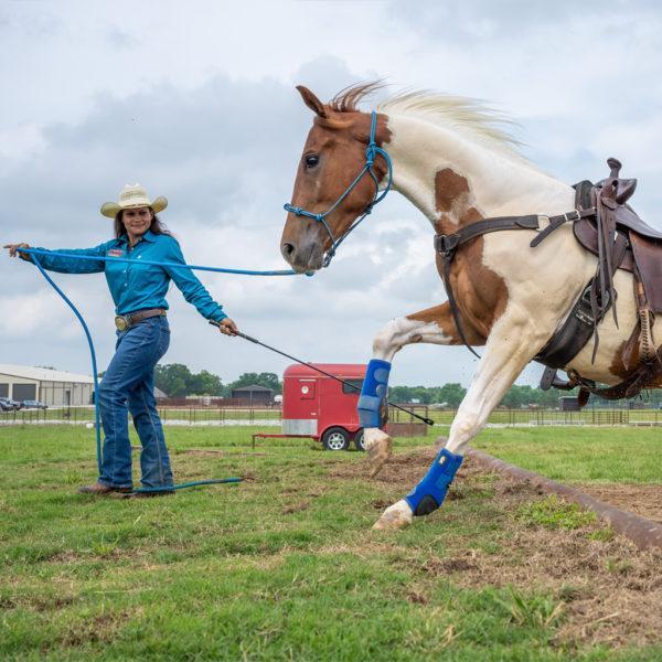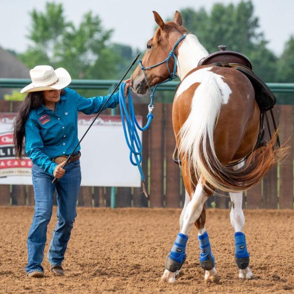 Her 20-year-old horse was well-mannered, but her husband’s mare came with a lot of issues. “She did just about everything – she pulled back, she was cinchy, she was difficult to bridle – you name it, she did it!” Miranda says.