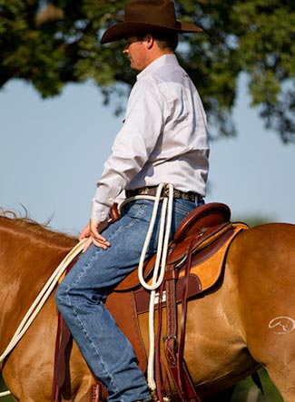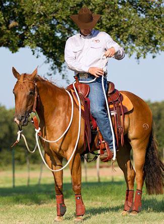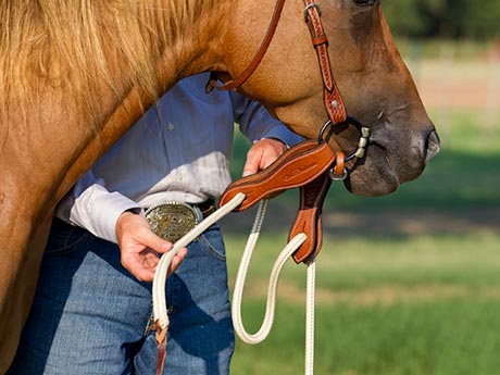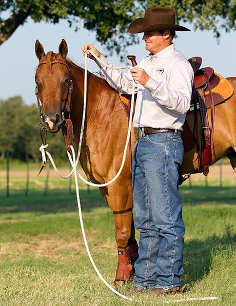 For either option, the slack in the rope should hang down slightly lower than the loop rein, hanging 2 to 3 inches below it. Reason being that you don’t want the lead to hinder the horse’s head if you are flexing to the right when mounted. If the lead is too short, your horse can’t flex far enough because he’ll run into pressure.Â