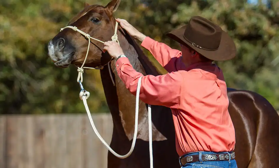 The biggest mistake people make with horses that are head shy is trying to protect them by sneaking around. I have a saying when I’m working around horses, “Heart attacks are free.” In other words, don’t tip-toe around your horse and be afraid to scare him. In reality, trying to protect your horse from objects he’s scared of only makes the situation worse. As a trainer, your goal is to desensitize your horse to as many objects that move and make a noise as you can. You can’t get that done if you’re afraid to scare him. When I’m desensitizing a horse, if he wants to get scared, that’s fine by me. Heart attacks are free. As long as I’m in a safe position, I don’t care if he has a heart attack.
