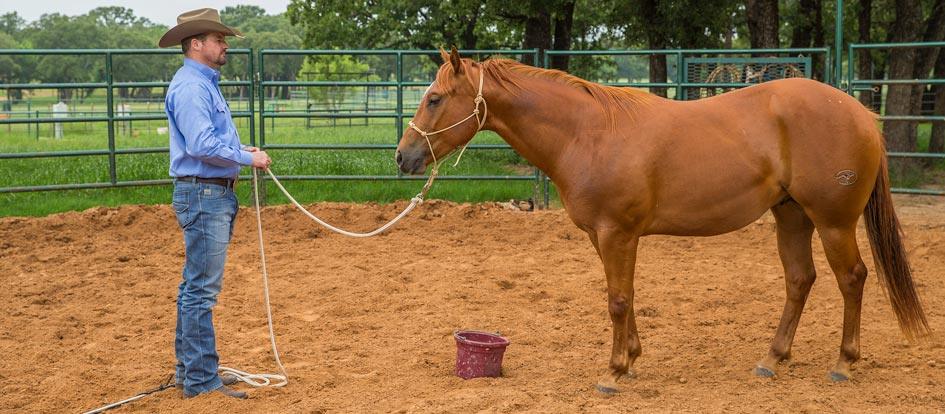 After you’ve worked the horse next to the feed bucket and he’s responding well, let him rest next to it. Stop him so that he has two eyes on you and let him rest with slack in the lead rope. If he goes to look away from you, get his attention back on you by bumping on the lead rope. If he tries to eat the feed, immediately put his feet to work.