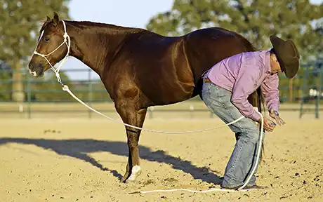Now of course, throughout this process, Blue did struggle some. After all, he had a longstanding habit of kicking. Anytime he got defensive about me touching his legs and kicked out, I immediately dropped his foot and put his feet to work. I yielded his hindquarters really fast, backed him up aggressively and made him really hustle for a few minutes. Then I brought him to a stop and went straight back to picking his foot up. I wanted him to realize that he had two options: Option A—stand still and relax while I handle your foot, or Option B—work hard and sweat. Since horses are basically lazy creatures— they’d rather stand still and relax than have to work hard—they’ll pick the option with the least amount of work involved. So it didn’t take Blue long to realize that as long as he stood still and relaxed while I handled his legs, life was good. But when he kicked out and threw a fit, he had to hustle his feet and work hard. I made the right thing easy and the wrong thing difficult.