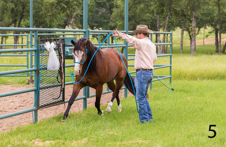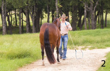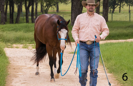 6. Just as much as I want my horses to lead respectfully beside me, I want them to lead well behind me. I hate feeling as if I’m dragging a horse behind me like a stolen dog. If I walk off or pick up my pace, I want my horse to be right there with me, coming off the halter pressure but staying a respectful distance away from me, not breathing down my neck. To teach a horse to lead behind me, I use the Intermediate exercise Leading Behind. It teaches a pushy horse that wants to run over top of you to respect your space, and it gets a lazy horse that drags behind you to come forward off light halter pressure. I find that this exercise works best when you do it at random times when the horse is least expecting it. It’s a test to see how quick he is to come off the halter pressure and follow you. When you’re leading him to or from the pasture, jog off and see what he does. You’ll notice that if you practice the exercise when the horse is least expecting it, he’ll start to pay more attention to you because he knows that at any time you might make his feet move.