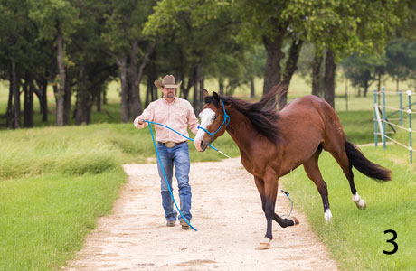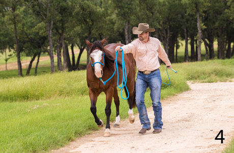 4. Horses aren’t born knowing how to be led. You have to teach them how to lead correctly. I use the Leading Beside exercise in the Fundamentals Series to teach horses to respect my space, pay attention to my cues and to take direction from me rather than pushing into my space and trying to lead me. This is a great exercise to practice while going to and from the pasture to keep your horse on his toes and to double-check his responsiveness. It’s especially useful with a lazier type of horse that has a tendency to want to drag behind you. The exercise reinforces to the horse that anytime he feels pressure from the halter behind his ears, he should immediately come forward off it rather than pull and lean against it.