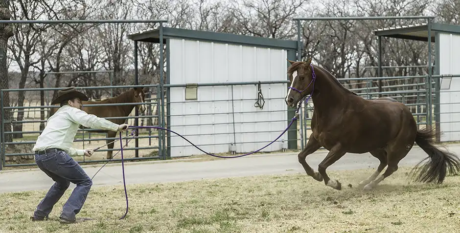 It doesn’t matter how you move the horse’s feet, just that you do as many changes of direction as you possibly can. A great exercise to practice is Lunging for Respect Stage Two, where you’ll ask the horse to trot energetically in a circle around you and then yield his hindquarters and roll back into the opposite direction he was going.