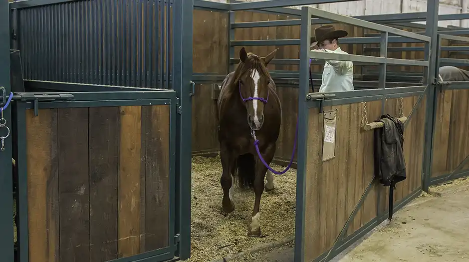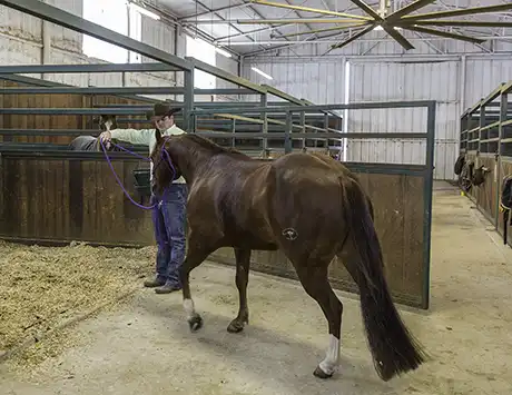 While you want the horse to calmly walk into and out of the stall, don’t be surprised if he initially trots through it. Don’t try to stop him from trotting, because that will only make him more nervous. Just keep sending him in and out of the stall until he relaxes on his own and walks.
