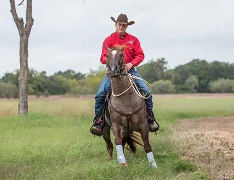 If your horse stops at a patch of clover and refuses to move, even if you’re bumping him on the sides, you need to get more aggressive. Remember to use Squeeze, Cluck and Spank. Squeeze the horse with the calves of your legs to get him to move. If he ignores your squeezing, cluck to him with your tongue, “cluck, cluck.” If he still isn’t moving, spank him with the end of your reins or a dressage whip. Squeeze is politely asking the horse to go. Cluck is warning him that the spank is going to come if he continues to ignore you. Spank is doing whatever it takes to get the horse’s feet to move. You may have to really get after him if he’s being disrespectful. Always be as easy as possible, but as firm as necessary. So if your horse leans on the lazy side of the scale and has his head buried in a patch of grass, you may really have to spank him to get him to move forward.